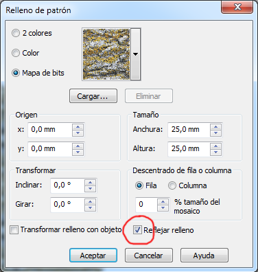 El relleno de Patrón es un mosaico, como si fueran baldosas. Si luego de aplicar el relleno de patrón aprietas la tecla G (relleno interactivo) puedes apreciarlo, ademas de poder modificarlo libremente. Normalmente, cada una se repite indefinidamente una al lado de la otra. Pero si activas la opcion de "Reflejar relleno", cada baldosa estará invertida respecto a la de al lado, arriba y abajo. Por supuesto, si el patrón es simétrico no se notará la diferencia.