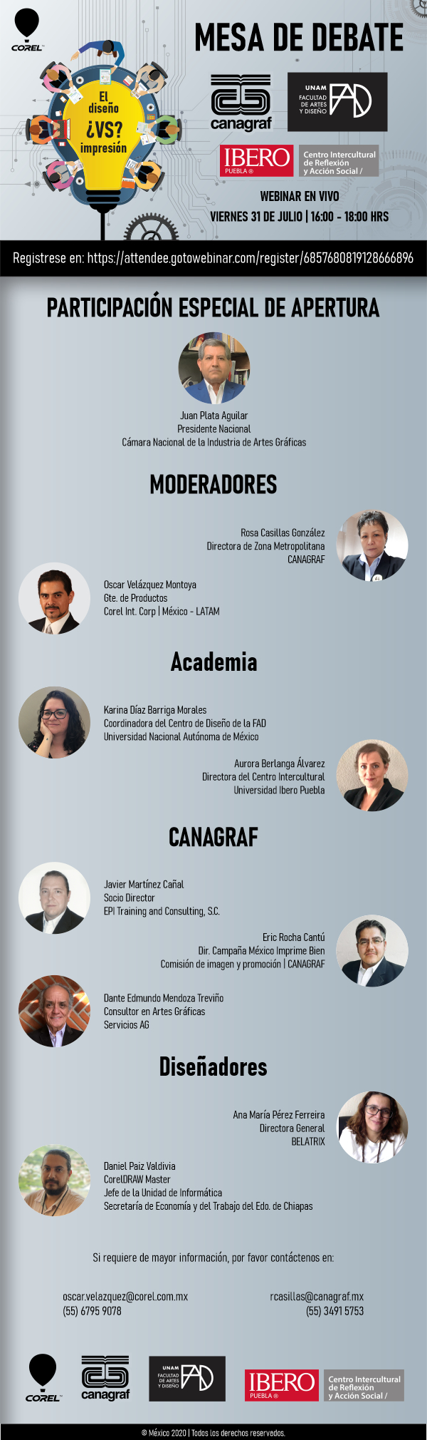 Asiste a la Mesa de Debate, organizada por la Cámara Nacional de la Industria de Artes Gráficas, Corel México, la Facultad de Artes y Diseño de la UNAM, y el Centro Intercultural de Reflexión y Acción Social de la universidad Ibero campus Puebla; además, tendremos la participación de prestigiosos diseñadores para complementar los criterios que buscarán dar respuesta a una pregunta que desde hace décadas a causado polémica: ¿ El diseño o el diseñador realmente está divorciado del mundo de la impresión y el correcto ejercicio técnico que implica lograr con éxito y sin contratiempos ni problemas sus archivos digitales al materializarlos en impresos físicos? Una pregunta muy amplia que ha merecido discusiones entre ambas partes y que es momento de abordar en una crítica constructiva que buscará encontrar bases y soluciones para prevenir y lograr eficientar la experiencia y colaboración entre ambos mundos para apoyar a toda la comunidad del mundo del diseño y la industria gráfica.